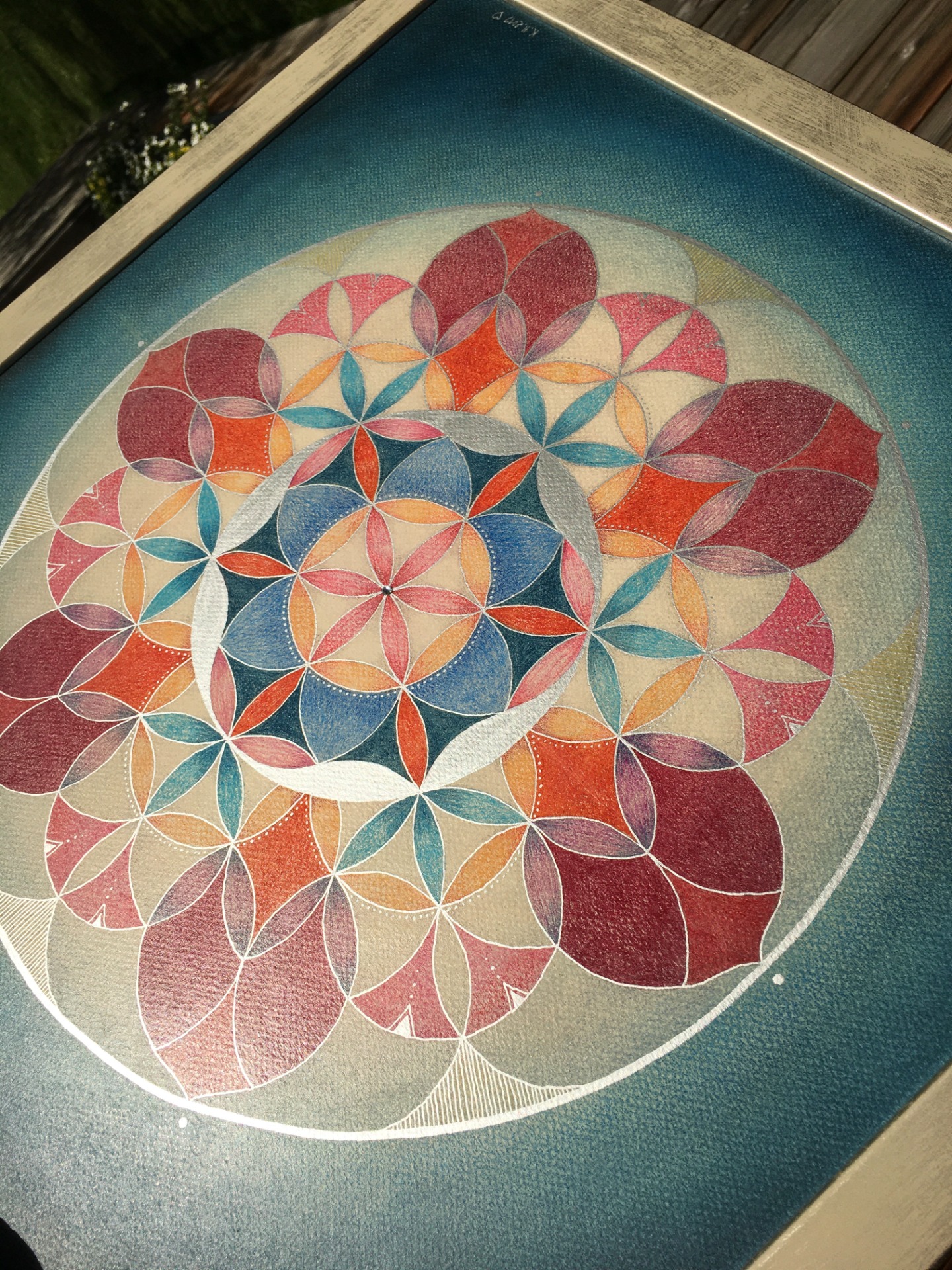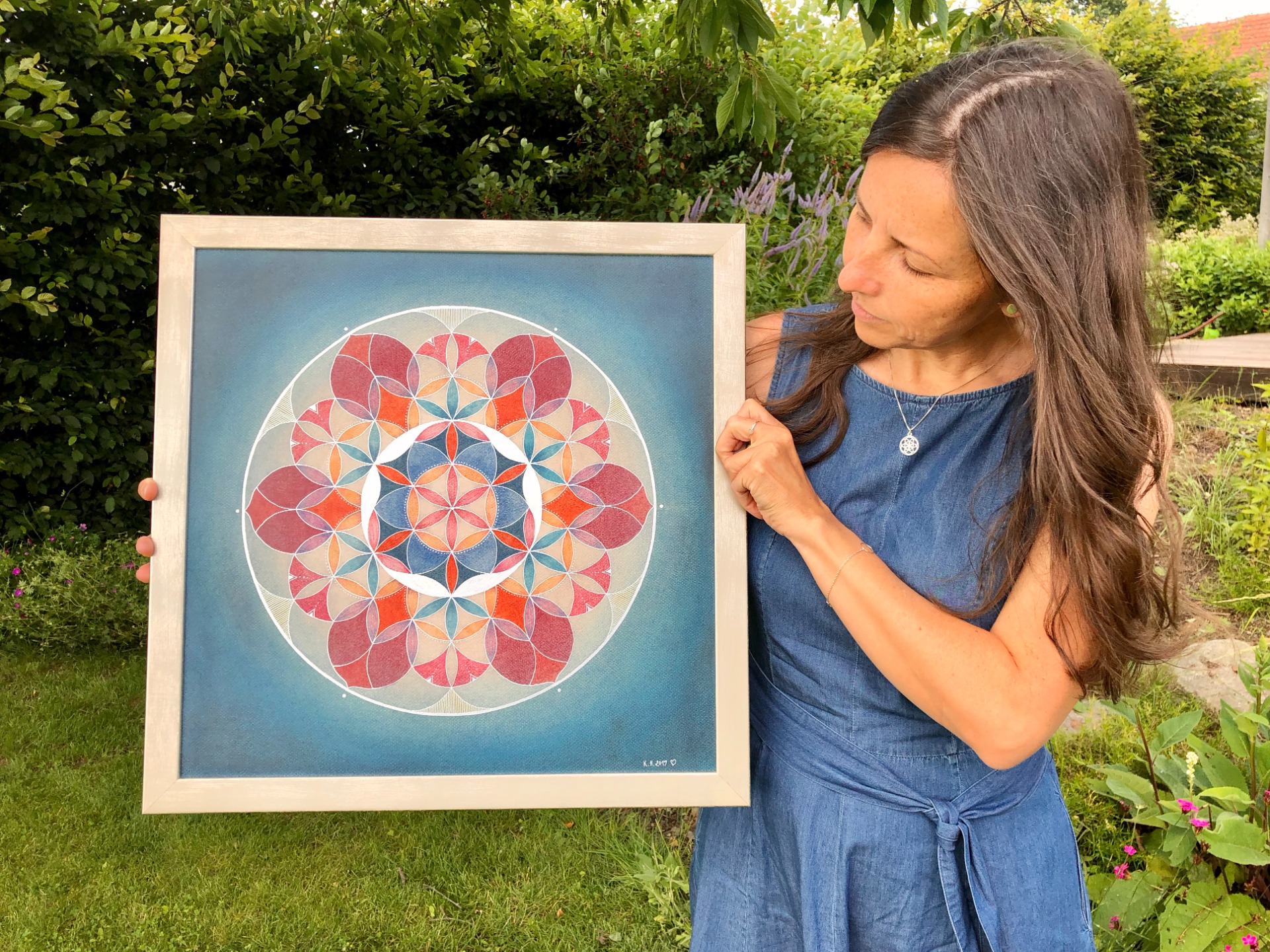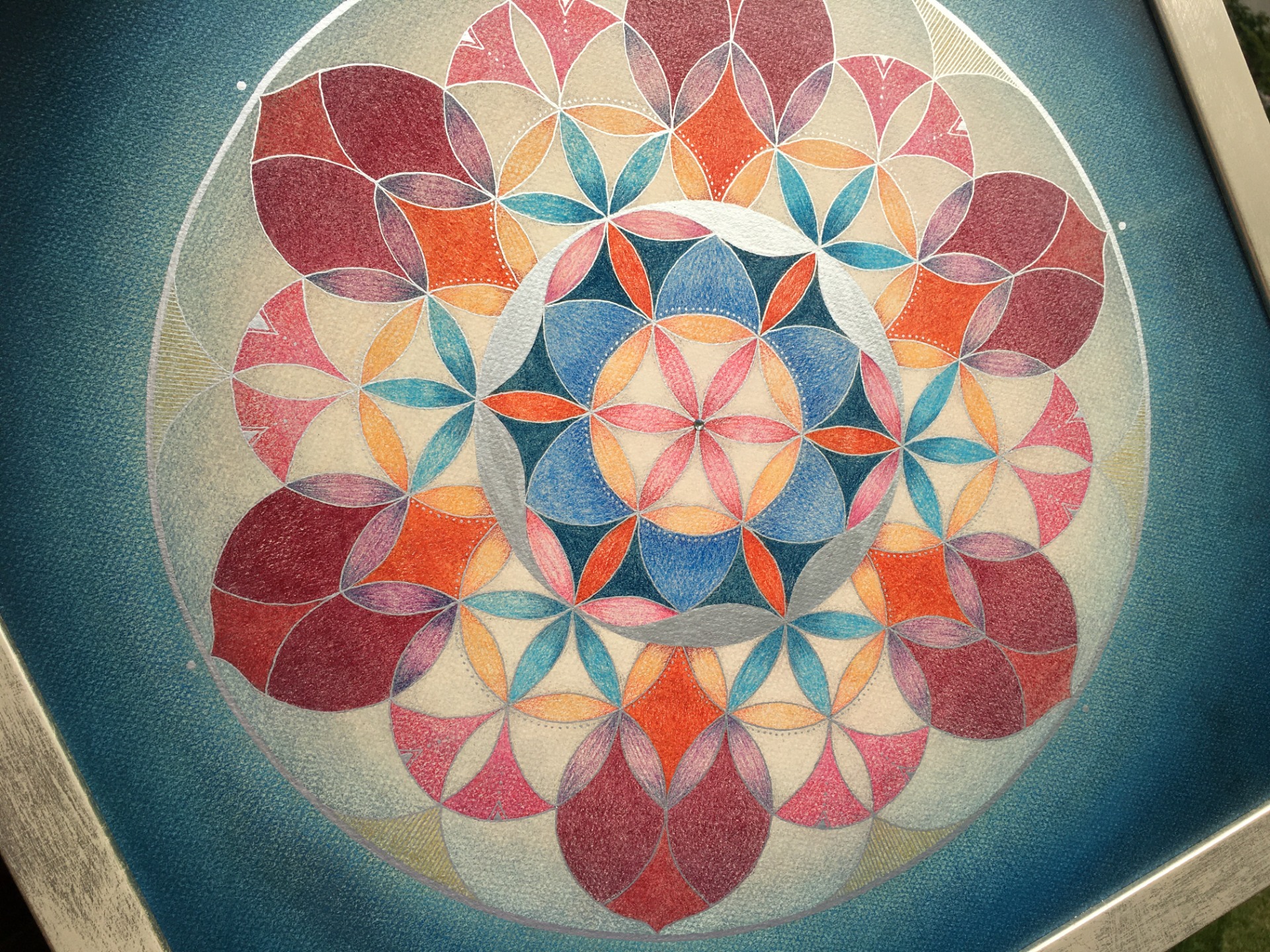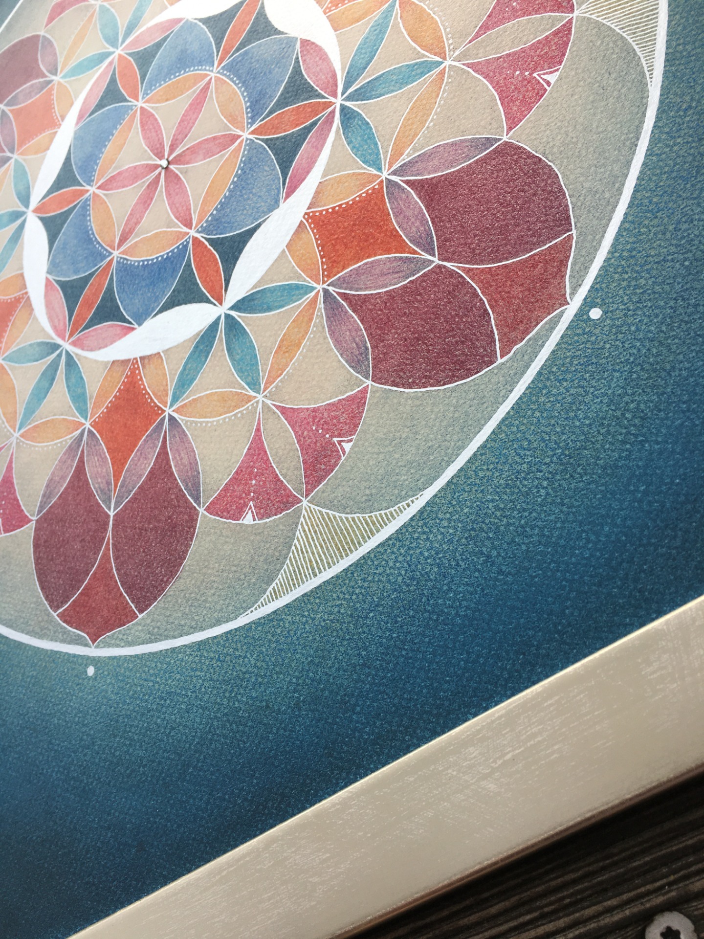 Mandala na kvalitním papíře. Pastel, pastelky, tuš, stříbrné plátky, kamínek Swarovski, zalakováno, zarámováno bez skla (tato skutečnost ladí s tématem zranitelnosti).